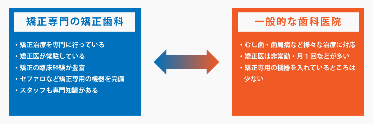 矯正専門の矯正歯科では、当然のことながら毎日開院から閉院まで矯正治療を行っています。対して一般的な歯科医院では、むし歯の治療や歯周病の治療、インプラント治療やブリッジ、顎関節症 の治療など、幅広い治療を行っています。そのため、矯正専門の矯正歯科では、ドクターの経験値や知識、技術力などの、矯正治療に対する総合力が、一般的な歯科医院の歯科医師と比べて、高いといえます。 一般的な歯科医院では、矯正医が月に 1 回などといった形で非常勤で勤務しており、来院した際に治療を行うといった形態が多いですが、矯正専門の矯正歯科では、矯正医が常勤しています。さらに矯正専門の矯正歯科では、 セファロや生理機能検査機器など、矯正治療に必須といえる医療設備も完備しています。